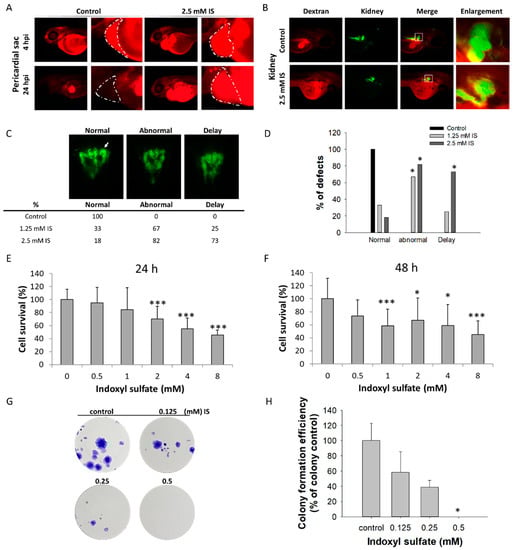 The adult AB strain, Tg(fli1:GFP) and Tg(wt1b:GFP) [] zebrafish were supplied by Academia Sinica’s Zebrafish Core Facility (TZCAS, Taipei, Taiwan) and Professor Christoph Englert. The zebrafish assays were approved by Kaohsiung Medical University (KMU), Kaohsiung, Taiwan (IACUC approval #107091). The zebrafish adults and embryos were cared for and maintained in accordance with the rules and standard protocols for animal care of the animal center of KMU []. The zebrafish were housed in aquaria at 28.5 °C under a 10 h dark/14 h light night/day cycle in the Zebrafish Core Facility, which was accredited by the Association for Assessment and Accreditation of Laboratory Animal Care International (AAALAC). For breeding, adult male and female fish were housed in a breeding tank at a ratio of 3 males to 2 females. The embryos were collected from the bottom of the tank and washed twice with oxygenated water. Indoxyl sulfate with potassium salt (Cayman Chemical Co., Ann Arbor, MI, USA) was dissolved in Milli-Q water as a vehicle solvent. The embryos were treated with 2.5 mM, 5 mM, or 10 mM IS at 24 h postfertilization (hpf) and examined daily.