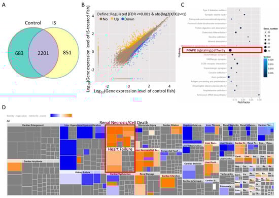 KEGG enrichment and IPA of differentially expressed genes in zebrafish. (A) The Venn diagram shows the coexpressed genes between IS-treated and control embryos. (B) Scatter plots of all expressed genes between IS-treated and control zebrafish embryos plotted as log10 (gene expression level with FDR ≤ 0.001 & abs(log2(X/X)) ≥ 1). (C) Scatter plot of KEGG enrichment analysis of the differentially expressed genes between IS-treated and control fish embryos. The red border indicates the candidate MAPK pathway. (D) Toxicological functions of the differentially expressed genes related to IS exposure.