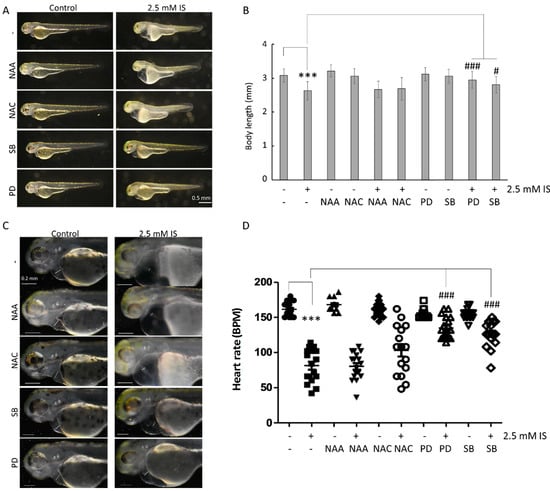 Zebrafish embryos exposed to 2.5 mM IS were shorter than control embryos (Figure 5A,B) and exhibited a greater incidence of pericardial edema and axial malformations. Additionally, IS affected the heart rate of zebrafish (Video S1). Zebrafish embryos were also treated with NAC; N-acetyl-alanine (NAA), a NAC analog without ROS-scavenging activity; SB203580, a p38 inhibitor; and PD98059, an ERK inhibitor. The results showed that the inhibition of p38 and ERK reversed the changes in body length (Figure 5A,B) and heart rate (Figure 5C,D) in zebrafish embryos induced by IS exposure.