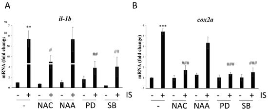 Effects of ROS scavengers and MAPK inhibitors on the mRNA expression of proinflammatory genes. qPCR-based assessment of the mRNA levels of (A) il-1b and (B) cox2a. ** p < 0.01 and *** p < 0.001 compared with the control group. # p < 0.05, ## p < 0.01 and ### p < 0.001 compared with the IS-treated group.