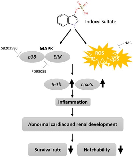 Kidney disease patients may have concurrent chronic kidney disease-associated mineral bone disorder and hypertension. Cardiovascular disease (CVD) and neuropathy occur due to kidney failure-induced accumulation of uremic toxins in the body. Indoxyl sulfate (IS), a product of indole metabolism in the liver, is produced from tryptophan by the intestinal flora and is ultimately excreted through the kidneys. Hemodialysis helps renal failure patients eliminate many nephrotoxins, except for IS, which leads to a poor prognosis. Although the impacts of IS on cardiac and renal development have been well documented using mouse and rat models, other model organisms, such as zebrafish, have rarely been studied. The zebrafish genome shares at least 70% similarity with the human genome; therefore, zebrafish are ideal model organisms for studying vertebrate development, including renal development. In this study, we aimed to investigate the impact of IS on the development of zebrafish embryos, especially cardiac and renal development. At 24 h postfertilization (hpf), zebrafish were exposed to IS at concentrations ranging from 2.5 to 10 mM. IS reduced survival and the hatching rate, caused cardiac edema, increased mortality, and shortened the body length of zebrafish embryos. In addition, IS decreased heart rates and renal function. IS affected zebrafish development via the ROS and MAPK pathways, which subsequently led to inflammation in the embryos. The results suggest that IS interferes with cardiac and renal development in zebrafish embryos, providing new evidence about the toxicity of IS to aquatic organisms and new insights for the assessment of human health risks. Accordingly, we suggest that zebrafish studies can ideally complement mouse model studies to allow the simultaneous and comprehensive investigation of the physiological impacts of uremic endotheliotoxins, such as IS, on cardiac and renal development.