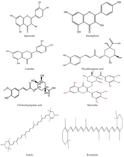 Carotenoids are lipophilic molecules that are naturally occurring pigments synthesized by photosynthetic plants, preventing excess energy damage to photosynthetic apparatus [47]. These pigments function as antioxidant chemicals, giving a variety of health advantages such as protection from cellular damage, ageing, and other chronic illnesses. These can also be used as popular dietary supplements such as food colorants. Moringa oleifera leaves have abundant carotenoids with a total amount varying from 44.30 to 80.48 mg/100 g on a fresh weight basis among eight different cultivars. The six different carotenoids that are mainly found in leaves are luteoxanthin, 15-Z-β-carotene, 13-Z-lutein, β-carotene, all-E-β-carotene, all-E-lutein, and all-E-zeaxanthin. All E-β-carotene and luteoxanthin have maximum and minimum purity in a purified carotenoid extract with 89 and 94%, respectively [31]. Phullakhandam and Failla [48] reported that lutein and β-carotene concentrations in fresh leaves are 418 and 272 mg/kg of dry weight, respectively, whereas in dried powdered leaves, it is 472 and 166 mg/kg, respectively. Environmental factors, post-harvest conditions, plant developmental stage, and cooking treatments adversely affect the quantity of carotenoids in the leaves. At the early developmental stage, plants have the highest carotenoids level, which decreases as plant growth progresses, and post-harvest storage at 0 °C also protects carotenoid levels [49]. Cooking at high temperatures also decreases carotenoid levels [50]. Carotenoids as potential antioxidants are attracting interest in terms of decreasing the incidence of certain types of cancer.