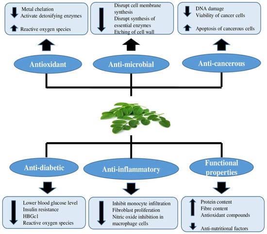 Functional foods are becoming more important in today’s daily life because many chronic diseases have become prevalent, and these foods can eliminate or lessen their intensity. After several research studies regarding functional foods, it was concluded that these products find an important place among consumers’ requirements as they provide health benefitting properties [162]. Excessive free radical generation in the body may deteriorate large macromolecules, such as DNA, lipids and proteins, that cause numerous chronic diseases [163]. Antioxidants may thus be important in the prevention and treatment of chronic diseases. Moringa oleifera is gaining importance as an important functional food (Figure 2) due to the higher nutritional content of its edible portions and the presence of potent antioxidant compounds.