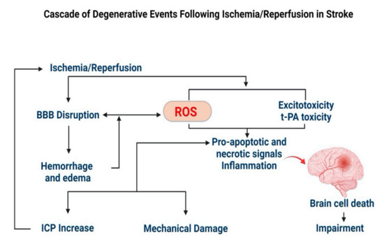 ROS-mediated degenerative events during a stroke. Excessive production of ROS during I/R injury leads to mechanical damage to the brain due to breakdown of the BBB, hemorrhage and edema, causing a build-up of intracranial pressure (ICP). The biochemical changes lead to inflammation and progression of apoptosis. Therefore, excess ROS formed during I/R is considered a target to inhibit the progression of secondary brain damage.