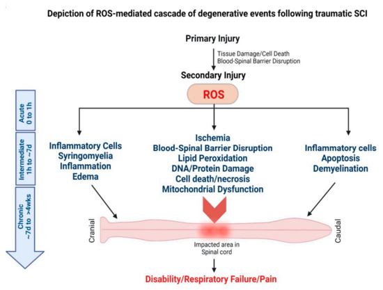 SCI is another common form of neuronal injury that causes neurological dysfunctions [99] and is characterized by an initial primary injury followed by the secondary phase of injury (Figure 3) [100]. Primary injury results immediately from the initial trauma causing damage to the blood vessels and axons [101]. In contrast, secondary injury is the indirect result of the primary injury that involves inflammation and oxidative stress [10]. The secondary injury progression occurs not only at the site of impact, but it spreads along the entire spinal cord, including the faraway segments of the spinal cord that are not impacted, making the condition more devastating and debilitating with time [101]. Following injury, the elevated levels of ROS and the consequent oxidative stress are considered critical events associated with the secondary injury progression [102]. Under oxidative stress condition, dysfunctional mitochondria become the source of ROS [103] that cause a further cascade of degenerative processes, particularly curtailing ATP production required for normal cellular functioning, thus promoting apoptosis [103]. The excess ROS alters cell functions by modulating ion channels, followed by excessive accumulation of intracellular calcium ions that eventually causes excitotoxicity [104]. Oxidative stress damages the microvascular endothelium that reduces the spinal cord white matter blood flow, resulting in ischemic injury [105].