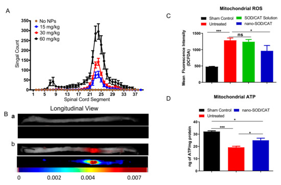 Antioxidant enzyme-based nanotherapy for spinal cord injury: Localization of nanoparticles at the lesion site following intravenous administration. Nanoparticles were injected 6 h post-injury, and spinal cords were analyzed for localization of the nanoparticles. Nanoparticles contained a near-infrared dye, and the spinal cords were analyzed 24 h after the injury using the Maestro Optical Imaging System site. Reproduced with permission from [350], copyright 2019 Elsevier. (A) Dose-dependent localization of nanoparticles at the lesion site. (B) Images of the spinal cord taken with Maestro Optical Imaging (Ba) Normal spinal cord without injury and nanoparticles. (Bb) Injured spinal cord from the animals that received dye-loaded nanoparticles intravenously. Efficacy of nano-SOD/CAT treatment (C)-treated animals show reduced mitochondrial ROS levels. (D) Mitochondrial isolated from the spinal cord of the treated animals show more ATP production capacity than those isolated from the spinal cords of untreated animals. * p < 0.05; *** p < 0.001 Reproduced with permission from [350], copyright 2019 Elsevier.