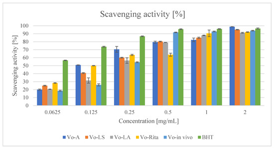 The results of the DPPH assay showed that all the tested extracts exhibited significant radical scavenging activity. The activity of 2 mg/mL concentrated extracts ranged from 91.16% (Vo-LA) to 98.82% (Vo-A) (Figure 3). Among the extracts, Vo-A extract was found to be the most effective, as was also confirmed by its IC50 value (0.081 mg/mL), and most importantly, the extract exhibited high efficiency at lower concentrations (91.97% at a dose of 0.50 mg/mL), which was comparable to the activity of BHT at the same concentration (95.71%). A comparison of IC50 values showed that the scavenging activity of extracts and standard decreased in the following order: BHT > Vo-A > Vo-RITA > Vo-LS > Vo-in vivo > Vo-LA (Table 4).