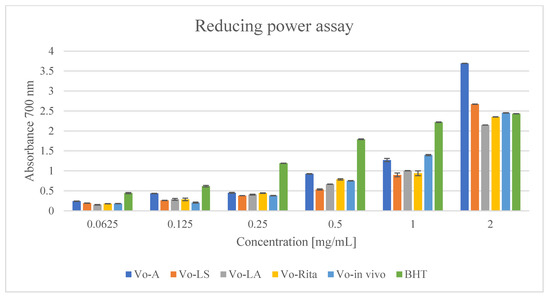 The reducing power of V. officinalis extracts was tested by the spectrophotometric measurement of Fe3+-to-Fe2+ transformation [32] using a Nanocolor UV/VIS spectrophotometer (Macherey-Nagel). Briefly, different concentration of each sample (0.0625–2 mg/mL) in 1 mL of methanol were mixed with 2.5 mL of 0.2 M phosphate buffer (pH 6.6) and 2.5 mL of 1% potassium ferricyanide [K3Fe(CN)6]. After incubation at 50 °C for 20 min, the solution was cooled rapidly in ice, mixed with 2.5 mL of 10% trichloroacetic acid, and centrifuged at RCF 1100 for 10 min. 2.5 mL of the resulting supernatants were mixed with 2.5 mL of deionized water and 0.5 mL of 0.1% freshly prepared ferric chloride (FeCl3) and left at room temperature for 10 min. The absorbance values of the samples were determined at 700 nm. Ascorbic acid and butylated hydroxytoluene (BHT), at the same concentrations as the tested samples, were used as the reference. The experiments were run in triplicates. The results were expressed as the mean absorbance values ± SD and ascorbic acid equivalents (ASE/mL) ± SD. The calibration curve equation obtained for ascorbic acid was y = 0.876x + 0.5833 (R2 = 0.9788).