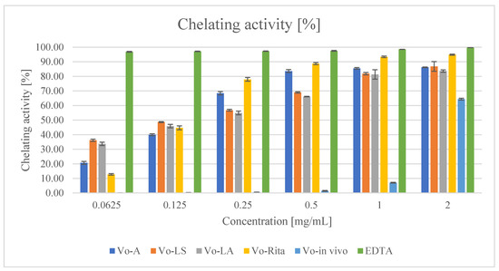 The results of the Fe2+ chelating activity assay showed that all the tested extracts from in vitro cultures interfered with the formation of the ferrous–ferrozine complex starting from a concentration of 0.0625 mg/mL (33.72% for Vo-LA to 36.18% for Vo-LS), while EDTA showed a very high inhibitory activity (96.87%). Among the tested extracts, Vo-in vivo extract showed the lowest chelating ability (0.53% at 0.25 mg/mL) (Table 4 and Figure 5). At the maximum tested dose of 2 mg/mL, Vo-RITA showed the most efficient chelating activity, but it was slightly lower than that of the standard EDTA (94.86% and 99.80%, respectively). According to the calculated IC50 values, Vo-RITA was the most effective extract (IC50 = 0.034 mg/mL), and the metal chelating effect of the extracts and EDTA decreased in the following order: EDTA > Vo-RITA > Vo-LS > Vo-A > Vo-LA > Vo-in vivo (Table 4 and Figure 5).
