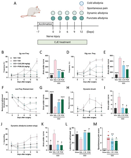 To investigate the antinociceptive effects of CJE on CCI-induced pain sensitivity, three types of allodynia (punctate, dynamic, and cold) and spontaneous pain behavior were evaluated. Punctate allodynia was measured using the von Frey filament test (Figure 1B–G). At baseline, there were no significant between-group differences. Following CCI, the pain response to punctate allodynia was increased in CCI rats, with increased frequency elicited by 2 and 10 g von Frey filament stimulation (Figure 1B–E) and decreased MWT in the von Frey filament test (Figure 1F,G). In this study, PGB served as a positive control, and treatment of PGB also reduced the CCI-induced pain sensitivity (Figure 1B–M). Pretreatment of CJE significantly decreased the response frequency to 2 and 10 g von Frey filament stimulation as compared with the CCI group (Figure 1B–E). In addition, decreased MWT was reversed in the CCI with CJE treatment group at 3–12 d post-surgery (Figure 1F,G). These results suggest that the oral administration of CJE dramatically reduced punctate allodynia in CCI rats.