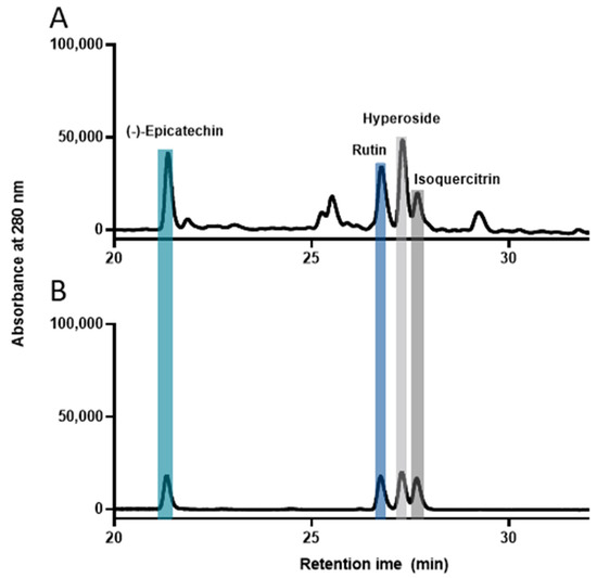 HPLC analysis was conducted using a Jasco HPLC system (Jasco, Tokyo, Japan) equipped with dual pumps, an autosampler, a column oven, and a detector. Chromatographic separations were carried out on a Waters Symmetry C18 column (particle size 5 μm, 4.6 × 250 mm) and monitored at 280 nm, with the temperature maintained at 35 °C. The injection volume was 10 μL, and the flow rate was 0.6 mL/min. CJE and the standard mixture were dissolved in 50% methanol. Reverse-phase HPLC assays were performed by gradient elution using a mobile phase comprising of (A) 0.5% formic acid and (B) acetonitrile:methanol (80:20 v/v), as follows: 0–30 min from 5–35%, 30–36 min from 35–90%, and 36–45 min from 90–5% elution gradient using solvent B. This condition was maintained for 5 min. The standard calibration curves for (−)-epicatechin, rutin, hyperoside, and isoquercitrin were linear (r2 > 0.999 **) in the range of 40–200 μg/mL. Analyses were performed in triplicate.
