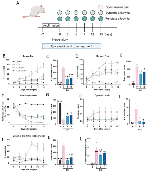 3.2. (−)-Epicatechin and Rutin Attenuates Chronic Constriction Injury-Induced Pain Sensitivity