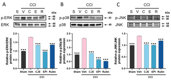 Effect of oral administration of CJE, (−)-epicatechin, and rutin on the mitogen-activated protein kinases (MAPKs) signaling pathway in the dorsal root ganglion (DRG) in chronic constriction injury model. (A–C) Representative Western blots and quantitative Western blot analysis of MAPKs expression were performed in L4–L5 DRG tissues. Representative Western blots and quantitative analysis of the protein levels of phosphorylated extracellular signal-regulated kinase (ERK)1/2 (A), p38 (B), and c-Jun N-terminal kinase (JNK) (C) in the DRG. Data are presented as the mean ± SEM of three independent experiments and analyzed using one-way ANOVA; *** p < 0.001 compared with CCI with the vehicle treatment group.