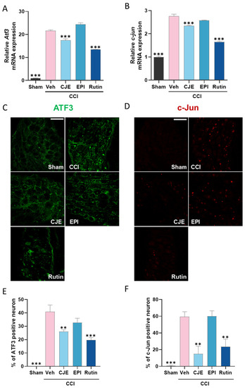 Effect of oral administration of CJE, (−)-epicatechin, and rutin on transcription factors in the dorsal root ganglion in a chronic constriction injury model. The mRNA expression of activating transcription factor 3 (Atf3) (A) and c-jun (B) was detected by the real-time polymerase chain reaction (qRT-PCR). Representative fluorescence images for ATF3 (C) and c-Jun (D). The bars represent the neurons positive for ATF3 (E) and c-Jun (F). The scale bar denotes 100 µm. Data are presented as the mean ± SEM of four independent experiments and analyzed using one-way ANOVA; ** p < 0.01, and *** p < 0.001 compared with CCI with the vehicle treatment group.