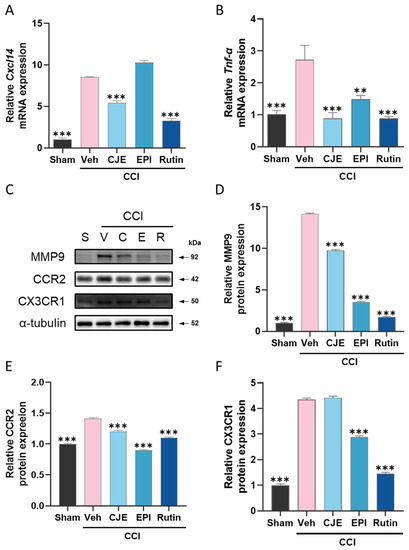 Effect of oral administration of CJE, (−)-epicatechin, and rutin on inflammatory mediators in the dorsal root ganglion (DRG) in a chronic constriction injury model. The mRNA expression of chemokine ligand 14 (Cxcl14) (A) and tumor necrosis factor α (Tnf-α) (B) were detected by qRT-PCR in the DRG. Representative Western blots of the protein levels of matrix metallopeptidase 9 (MMP9), C-C chemokine receptor type 2 (CCR2), and CX3C chemokine receptor 1 (CX3CR1) in the DRG (C). Quantitative analysis of the protein levels of MMP9 (D), CCR2 (E), and CX3CR1 (F). Data are presented as the mean ± SEM of three and four independent experiments for mRNA and protein expression, respectively, and analyzed using one-way ANOVA; ** p < 0.01 and *** p < 0.001 compared with CCI with the vehicle treatment group.