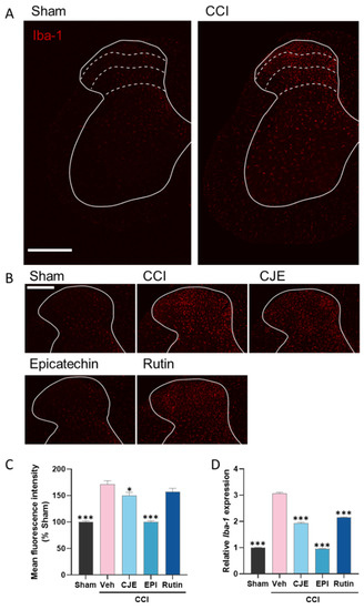 Microglial activation is involved in the development of neuropathic pain. Since pretreatment with CJE and its active compounds improved the neuropathic behavior of the CCI model, we focused on the microglia. We evaluated the effect of CJE, (−)-epicatechin, and rutin on CCI-induced microglial activation in the spinal dorsal horn using immunohistochemistry and qRT-PCR. Immunohistochemical analysis showed that ionized calcium-binding adaptor molecule 1 (Iba-1), a marker of microglia, was increased in the ipsilateral dorsal horn of CCI rats compared to that in sham rats (Figure 7A). As shown in Figure 7B,C, compared with the CCI group, CJE and its active compounds significantly decreased CCI-induced Iba-1 expression. Specifically, (−)-epicatechin treatment showed a significant reduction in Iba-1 expression, with expression levels similar to those in the sham group (Figure 7B,C). Similar to the immunohistochemistry data, we confirmed the above results using qRT-PCR analysis (Figure 7D). These results suggest that CJE, (−)-epicatechin, and rutin attenuate pain sensitivity in the CCI model by suppressing spinal microglial activity.