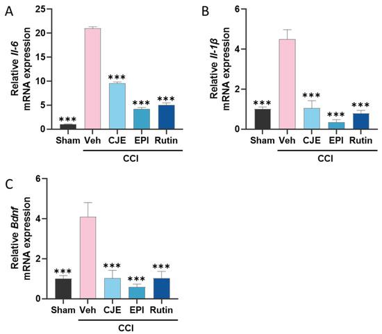 Effect of oral administration of CJE, (−)-epicatechin, and rutin on neuroinflammation in the spinal cord in the chronic constriction injury model. The mRNA expressions of Interleukin-6 (Il-6) (A), Il-1β (B), and brain-derived neurotrophic factor (Bdnf) (C) were detected by qRT-PCR. Data are presented as the mean ± SEM of four independent experiments and analyzed using one-way ANOVA; *** p < 0.001 compared with CCI with the vehicle treatment group.