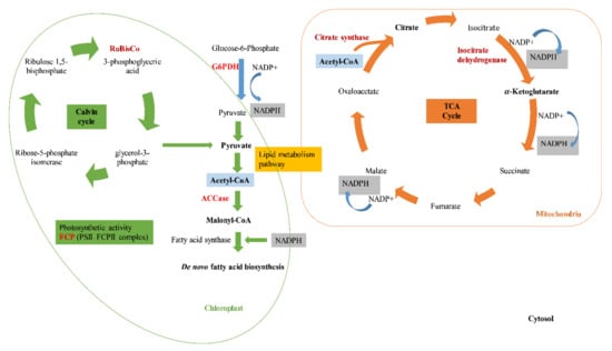- Wu, S.; Huang, A.; Zhang, B.; Huan, L.; Zhao, P.; Lin, A.; Wang, G. Enzyme activity highlights the importance of the oxidative pentose phosphate pathway in lipid accumulation and growth of Phaeodactylum tricornutum under CO2 concentration. Biotechnol. Biofuels 2015, 8, 78. [Google Scholar] [CrossRef] [PubMed]
