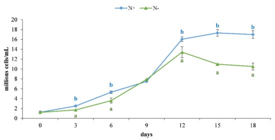 Growth performance of P. tricornutum cultivated for 18 days under standard (N+, blue line) and starvation condition (N−, green line). Values are presented as the mean ± SEM (n = 3) with standard deviations. Different letters within the same day indicate significant differences (p < 0.05) within the two treatment conditions (i.e., N+ and N−).