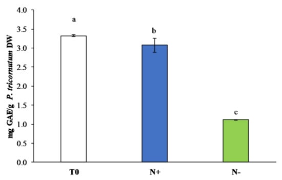 Total polyphenol content (mg GAE/g DW) in P. tricornutum extracts cultivated for 15 days under initial culture conditions (T0, white bar), under standard conditions (N+, blue bar), and under starvation conditions (N−, green bar). Values are reported as the means (n = 3), and error bars report the standard deviations. Treatments that do not share the same letter were significantly different from each other (p < 0.05).