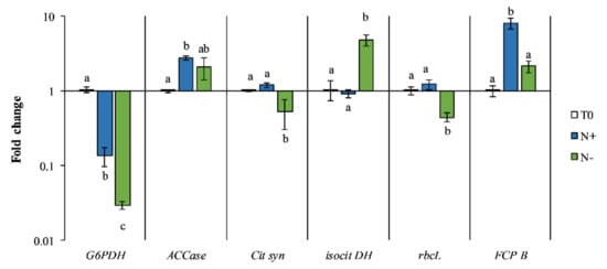 Diatoms show remarkable diversity among species and a great capacity to adapt their metabolism to different nutritional strategies [,]. Relevant genes related to lipid biosynthesis (i.e., G6PDH, ACCase, Cit syn, and isocit DH) and photosynthetic activity (i.e., rbcL and FCP B) were analyzed in P. tricornutum maintained under two different culture conditions (i.e., N+ and N−) (Figure 9).