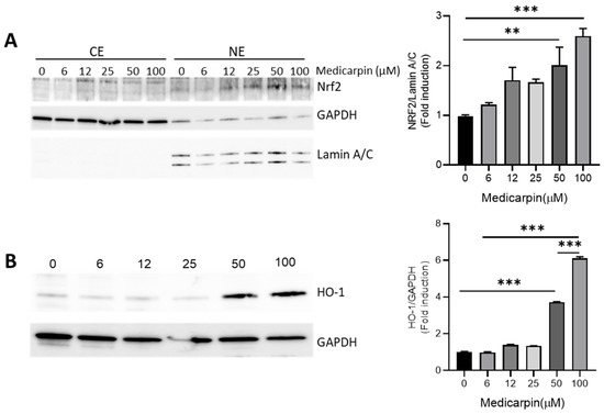 Medicarpin increases nuclear NRF2 accumulation, which results in HO-1 induction in HeLa cells. (A). Western blotting data shows nuclear NRF2 level after treatment with different concentrations of medicarpin for 6 h. The densitometrical analysis of nuclear NRF2 is shown in the right panel. (B). Western blot analysis using whole cell lysates shows the HO-1 level after treatment with the indicated concentration of medicarpin for 24 h. The densitometrical analysis of HO-1 is shown in the right panel. GAPDH and Lamin A/C were used as cytoplasmic and nuclear markers, respectively. CE, cytoplasmic extract; NE, nuclear extract. The experiments were repeated three times with similar results. ** p < 0.001; *** p < 0.0001.