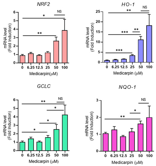 Medicarpin induces the transcriptional level of NRF2 and NRF2 target genes in HeLa cells. A. Real-time PCR analysis showed the mRNA levels of NRF2, HO-1, GCLC, and NQO-1 after treatment with different concentrations of medicarpin for 24 h in HeLa cells. Experiments were performed in triplicate. * p < 0.05; ** p < 0.001; *** p < 0.0001; NS, not significant.