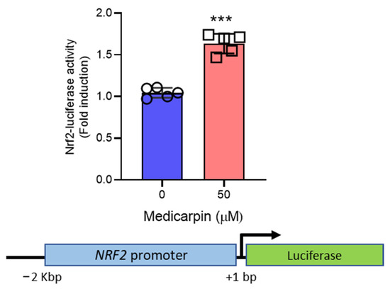 Medicarpin induces the NRF2 transcriptional level in Hela cells. Cells were treated with 50 μM of medicarpin for 6 h in the condition of transfection with an NRF2-promoter luciferase construct. NRF2-luciferase activity was measured using a Dual-Luciferase Reporter Assay kit (Promega) according to the manufacturer’s instructions. Experiments were performed in quintuplicate. *** p < 0.0001.