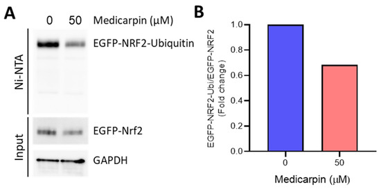 To explore whether medicarpin could affect the NRF2 stability for further induction of NRF2 target genes since NRF2 protein undergoes the ubiquitin-mediated proteasomal degradation pathway using the KEAP1-Cul3 system [15], we tested the NRF2 stability by using the EGFP-NRF2-Ubiquitin system. The cells were treated with 50 μM of medicarpin for 6 h in the presence of expression of EGFP-NRF2 and His-Ubiquitin. After the Ni-NTA purification step, we observed that the levels of ubiquitinated EGFP-NRF2 were significantly decreased by medicarpin (Figure 5), suggesting that medicarpin also potentiated the NRF2 stability by inhibiting the ubiquitination of EGFP-NRF2.