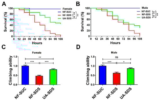 Figure 1. The reduced survival rate and climbing ability caused by sodium dodecyl sulfate (SDS) could be improved by ulcerative colitis (UA) in Drosophila. (A,B) The ulcerative colitis (UC) model group (NF-SDS) showed shorter life span than control group (NF-SUC). The 100 μM UA supplementation (UA-SDS) can significantly elevate the decreased survival rates of both female (A) and male (B) flies exposed to 0.5% SDS (NF-SDS). (C,D) The UC model group (NF-SDS) showed decreased climbing ability compared to the control group (NF-SUC). UA supplementation (UA-SDS) elevated the reduced climbing ability of female (C) and male (D) flies treated with 0.5% SDS. * p < 0.05, ** p < 0.01, *** p < 0.001, ns: not significant.
