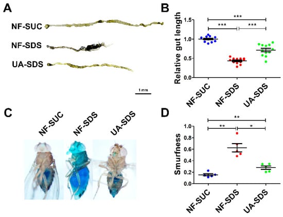Figure 2. UA alleviated SDS-induced impairment of intestinal morphology and barrier integrity. (A) After exposure to 0.5% SDS for 48 h, the intestines of these flies (NF-SDS) appeared shorter than control (NF-SUC), UA significantly increased the intestine length. (B) Quantitative measurement of (A) (n ≥ 10). (C) A small amount of blue dye occurred in the gut of control flies (NF-SUC) while the blue dye escaped throughout the whole body of UC model flies exposed to 0.5% SDS for 48 h (NF-SDS), which can be prevented by pre-feeding of UA (UA-SDS). (D) The intestinal barrier permeability was quantified by measuring the Smurfness (n = 5). * p < 0.05, ** p < 0.01, *** p < 0.001.