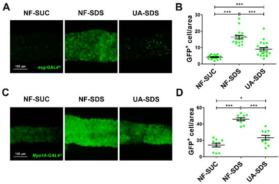 Myo1A is specifically expressed in enterocytes (ECs) [48]. Subsequently, we used the GFP level of Myo1A-GAL4ts to analyze the numbers of ECs. As shown in Figure 3C,D, we found that SDS could promote EBs to further differentiate into ECs in the NF-SDS group (a 2.2-fold increase in fluorescence intensity of Myo1A GFP+ cells, compared with the control group). As expected, the increased ECs in the NF-SDS group could be significantly attenuated by UA; however, the number of ECs in the UA-SDS group remained larger than the control group (p < 0.05). These results indicated that the ISCs proliferation and differentiation induced by SDS could be rescued by UA.