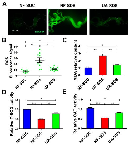 Figure 4. UA protected intestine from SDS-induced oxidative damage. (A) UA protected epithelial cells against SDS-induced oxidative stress. H2DCFDA staining of the anterior midgut of a female fly after ingestion of 0.5% for 48 h. (B) Fluorescence intensity of ROS levels in panels (n ≥ 10). (CE) UA supplementation alleviated malondialdehyde (MDA) levels and increased the activities of total superoxide dismutase (T-SOD) and catalase (CAT), after exposure to SDS for 48 h. * p < 0.05, ** p < 0.01, *** p < 0.001.