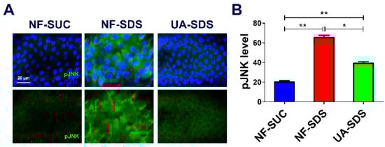Figure 5. UA alleviated SDS-induced intestine damage by inhibiting c-Jun N-terminal kinase (JNK) signaling. (A) Immunohistochemistry indicated that the induced level of phosphorylated JNK (pJNK) as well as the aberrant nucleus morphology caused by SDS were attenuated by UA. (B) Quantification of pJNK levels in the intestines (n ≥ 6). * p < 0.05, ** p < 0.01.