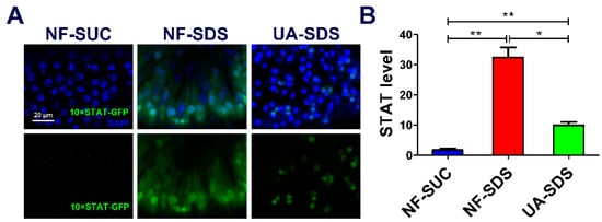 JNK acts synergistically with JAK/STAT in response to tissue damage in fly tissues [58]. Intestine damage caused by feeding flies with chemicals stimulates ISC proliferation through the JNK-regulated JAK/STAT pathway [59]. Given that chemical SDS is long known to cause JAK/STAT activation [44], we examined whether the JAK/STAT signaling participates in UA’s protective mechanism. As shown in Figure 6A,B, the STAT activity was obviously activated in the NF-SDS group (feeding SDS for 48 h) as monitored by expression of 10×STAT-GFP (a 17.7-fold increase), compared with the control group. Pre-supplemented UA could alleviate the upregulated expression of 10×STAT-GFP [37] (down 69%) (Figure 6A,B). These data suggested that UA may regulate the JNK/JAK/STAT responsive module to maintain Drosophila intestine homeostasis from toxic chemical-induced disruption.