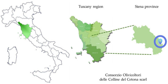 EVOO samples were collected from different farms located in a small area of the southern province of Siena, Tuscany. The olive trees from different cv., including Frantoio, Leccino, Minuta di Chiusi, Moraiolo, Greggiolo, and others, were grown at different altitudes, in a range between 300 and 600 m above sea level. The fruits were collected between 20 October 2020 and 26 November 2020 and cold-milled no more than 12 h after the harvest at the olive oil mill “Olivicoltori delle Colline del Cetona S.c.a.r.l.”, S.S. 321 km 11, 53040 Cetona, Siena, Tuscany, Italy (Figure 1). The samples were collected on the same day of the milling and stored in dark glass bottles at 4 °C for no more than 3 days before the start of the analyses.