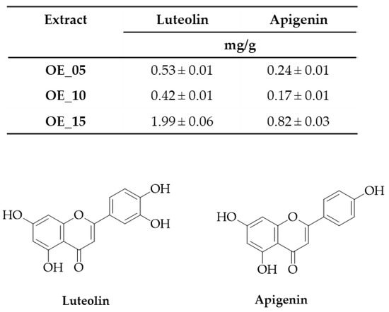 Quantification of luteolin and apigenin in EVOO extracts (OE).