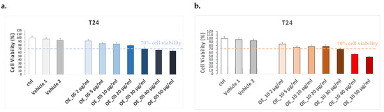 Upon arrival, EVOO extracts were suspended in 100 μL of DMSO and stored at 4 °C, avoiding direct light. The MTT assays for OE_05, OE_10, and OE_15 were performed on CaCo-2 cells to evaluate the non-toxic treatment dose. Cells were treated for 24 h with different concentration of EVOO extracts (2, 5, 10, 20, and 50 μg/mL) and DMSO at different doses (vehicle 1 and vehicle 2), suspended in completed DMEM high-glucose media.