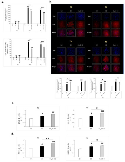 (a) H2O2 levels in media of CaCo-2 cells treated with 20 μg/mL OE_05 or OE_10 for 24 h and exposed to GO 0.5 U/mL for 1 h (T0, T30′, T1). (b) Immunofluorescence staining of DAPI (blue) and Nrf2 (red), 0 and 1 h post-GO exposure in CaCo-2 cells pre-treated with 20 μg/mL of OE_05 or OE_10 for 24 h. Original magnification at 40x; scale bar = 40μm. The immunofluorescent signal was semiquantified by using ImageJ software (National Institutes of Health, Bethesda, MD) and the quantification graphs are displayed in the bottom panel. Transcript levels of GPx1 (c) and NQO1 (d) measured using qRT-PCR 6 h post-GO exposure in CaCo-2 cells pre-treated with EVOO extracts for 24 h. Data are the results of the averages of at least three different experiments, # p < 0.05, ## p < 0.01, ### p < 0.001 GO ± OE_05 or OE_10 vs. ctrl and ¥ p < 0.05, ¥¥ p < 0.01, ¥¥¥ p < 0.001 GO + OE_05 or OE_10 vs. GO as assessed by one-way ANOVA.