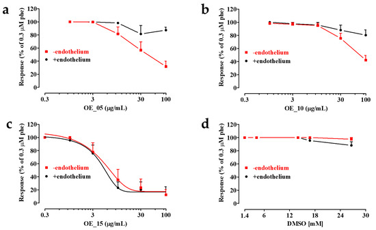 Effect of the EVOO extracts on phenylephrine-induced contraction of rat aorta rings. Concentration-response curves of (a) OE_05, (b) OE_10, and (c) OE_15 on endothelium-denuded (-endothelium) or endothelium-intact (+endothelium) preparations pre-contracted by 0.3 µM phenylephrine (phe). (d) The effects of the vehicle DMSO are shown. In the ordinate scale, the response is reported as a percentage of the initial tension induced by phenylephrine, taken as 100%. Data are means ± SEM (n = 5–9).