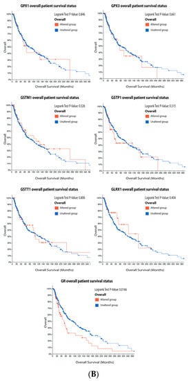 It is possible to observe in our data analysis, presented in the Figure 5, that 6% of the patients have alteration on the GPX1 gene, 5% on GPX3, 10% on GSTM1, 13% on GSTP1, 10% on GSTT1, 5% on GLRX1, and 15% on GR. The most prevalent alteration was increased mRNA expression, except for GR that showed decreased mRNA expression (Figure 5A). Only GR alteration on patients had a significative decrease in survival (Figure 5B). Glutathione-related enzymes are differentially expressed in melanoma progression. GPX1 is increased in VGP melanoma compared to common nevus (Figure 5C). GPX3 is decreased in metastasis (Figure 5C). GSTM1 is not altered (Figure 5C). GSTP1 is decreased in metastasis compared to common and dysplastic nevus (Figure 5C). GSTT1 is decreased in VGP and metastatic melanoma compared to common and dysplastic nevus (Figure 5C). GLRX is decreased in metastatic melanoma compared to dysplastic nevus (Figure 5C). GR is increased in metastasis compared to common and dysplastic nevus (Figure 5C).