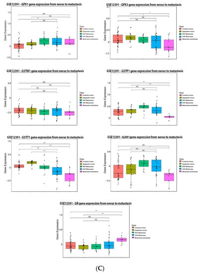 Glutathione-related enzymes on melanoma. (A) Percentage of patients with altered genes and types of genetic alterations; (B) overall patient survival status, and (C) expression in melanoma progression. Red boxes represent the common nevus, yellow boxes the dysplastic nevus, green boxes the radial growth phase (RGP) melanoma, blue boxes the vertical growth phase (VGP) melanoma, and purple boxes the metastatic melanoma. The statistical analysis was performed by ANOVA followed by Tukey test, *** p < 0.001, ** p < 0.01, * p < 0.05, when compared to common or dysplastic nevus. NS: Not significant.