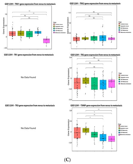 Our data analysis in Figure 6 shows that 34% of the melanoma patients presented alteration on the TRX1 gene, while 7% showed alterations on TRX2, 8% on TR1 and TXNIP, 13% on TR2, and 10% on TR3. The most common alteration was decreased mRNA expression for TRX1, missense mutation for TRX2, increased mRNA expression for TR1-3, and amplification for TXNIP (Figure 6A). Only the altered group of patients with a mutation on TR2 demonstrated significative impact on patient survival (Figure 6B). TRX1 is significantly decreased in metastasis compared to common and dysplastic nevus (Figure 6C), while TRX2 and TR2 showed no differences in expression (Figure 6C). No data for TR1 and TR3 were found about expression in melanoma progression. TXNIP is significantly decreased in VGP and metastasis (Figure 6C).