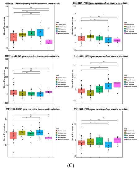 As observed in Figure 7, 15% of the melanoma patients have alteration on the PRX1 gene, 7% on PRX2, 17% on PRX3, 10% on PRX4, 8% on PRX5 and 14% on PRX6. The most prevalent type of mutation was increased mRNA expression for PRX1, PRX2, PRX4, PRX5 and PRX6, while the most common mutation for PRX3 was decreased mRNA expression (Figure 7A). Alterations on PRX3 and PRX5 had a significant impact on diminishing patient survival (Figure 7B). PRX1 and PRX5 were increased in melanoma vertical growth phase, and decreased in metastatic melanoma, when compared to normal nevus (Figure 7C). PRX2 and PRX6 were significantly decreased in melanoma compared to nevus (Figure 7C), while PRX3 and PRX4 were increased (Figure 7C).