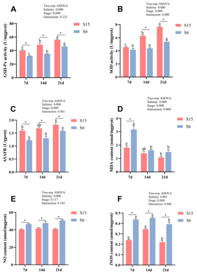 Combined effect of salinity and different development stages on Glutathione peroxidase (A, GSH-Px); superoxide dismutase (B, SOD); anti-superoxide anion free radical compound (C, ASAFR); malondialdehyde (D, MDA); nitric oxide (E, NO); inducible nitric oxide synthase (F, iNOS) of Macrobrachium rosenbergii post-larvae. Note: Data are mean values of nine replicates expressed as mean ± SE. “a, b, c” showed significant differences (p < 0.05) in the same group between different development stages. “*” showed significant differences (p < 0.05) between different salinity under the same development stages.