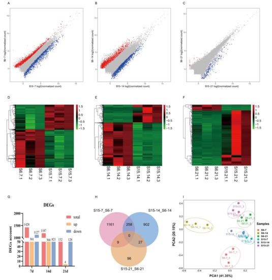 Effects of hypotonic stress at different development stages of M. rosenbergii post-larvae on gene expression. Note: (A–C): the scatter plots showed the differences of gene expression of hypotonic stress in 7, 14, 21 day-post-hatch larvae, respectively; Red represents upregulated genes, blue represents downregulated genes; (D–F): the heatmap showed differential gene expression of hypotonic stress in 7, 14, 21 day-post-hatch larvae, respectively; Red represents upregulated genes, green represents downregulated genes; (G): the histogram showed the counts of different expression genes in different group; (H): Venn diagram comparing the expression distribution of different expression genes; (I): Principal component analysis (PCA) for the correlation among samples in different group. S6-7: 7 day-post-hatch larvae in 6 psu salinity; S15-7: 7 day-post-hatch larvae in 15 psu salinity; S6-14: 14 day-post-hatch larvae in 6 psu salinity; S15-14: 14 day-post-hatch larvae in 15 psu salinity; S6-21: 21 day-post-hatch larvae in 6 psu salinity; S15-21: 21 day-post-hatch larvae in 15 psu salinity.