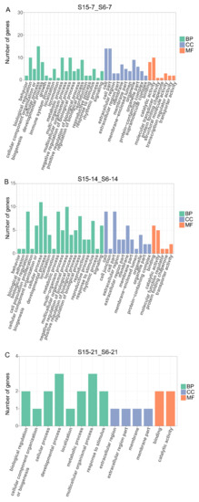Enriched GO terms for DEGs in M.rosenbergii post-larvae under hypotonic stress at different development stages. Note: (A): DEGs of comparison group S15-7_S6-7 enriched GO terms; (B): DEGs of comparison group S15-14_S6-14 enriched GO terms; (C): DEGs of comparison group S15-21_S6-21enriched GO terms. S6-7: 7 day-post-hatch larvae in 6 psu salinity; S15-7: 7 day-post-hatch larvae in 15 psu salinity; S6-14: 14 day-post-hatch larvae in 6 psu salinity; S15-14: 14 day-post-hatch larvae in 15 psu salinity; S6-21: 21 day-post-hatch larvae in 6 psu salinity; S15-21: 21 day-post-hatch larvae in 15 psu salinity.