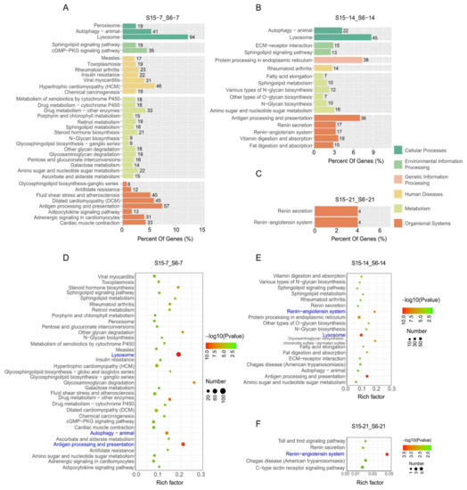 Enriched KEGG pathways for DEGs in M.rosenbergii post-larvae under hypotonic stress at different development stages. Note: (A–C): KEGG pathways involved in different categories at 7 dph, 14 dph, 21 dph larvae; (D–F): The most significant enrichment KEGG pathways at 7 dph, 14 dph, 21 dph larvae. S6-7: 7 day-post-hatch larvae in 6 psu salinity; S15-7: 7 day-post-hatch larvae in 15 psu salinity; S6-14: 14 day-post-hatch larvae in 6 psu salinity; S15-14: 14 day-post-hatch larvae in 15 psu salinity; S6-21: 21 day-post-hatch larvae in 6 psu salinity; S15-21: 21 day-post-hatch larvae in 15 psu salinity.