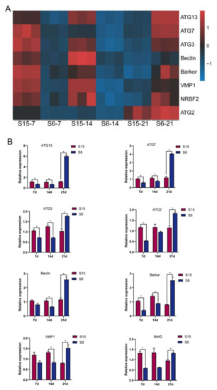 Relative levels of autophagy signaling based on transcriptome analysis and qPCR validated. Note: (A): heatmap of relative levels of key genes of autophagy signaling retrieved from RNA-seq database; (B): relative transcripts levels (qPCR validation) of autophagy signaling key genes, β-actin was used as an internal control. * p < 0.05.