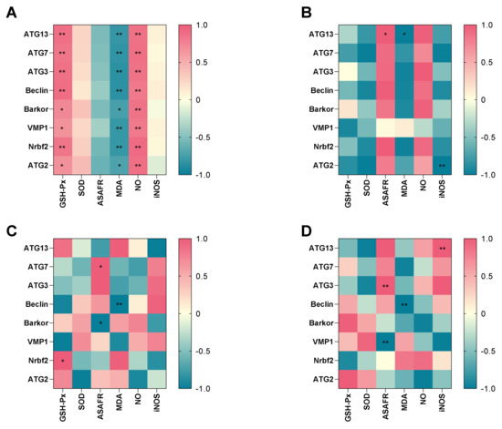 Correlation between antioxidant parameters and key different expression genes in hypotonic stress group. Note: (A): the correlation in hypotonic stress group; (B): the correlation in 7 dph larvae under hypotonic stress; (C): the correlation in 14 dph larvae under hypotonic stress; (D): the correlation in 21 dph larvae under hypotonic stress. The heat-map shows the Pearson correlation coefficient. The intensity of the colors represents the degree of association. * p < 0.05, ** p < 0.01.